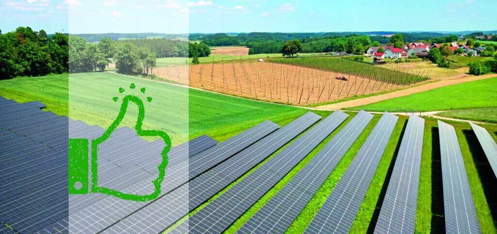 Abb.: Solarpark Viecht © ÖKORENTA Gruppe, Daumen hoch © barks, stock.adobe.com
